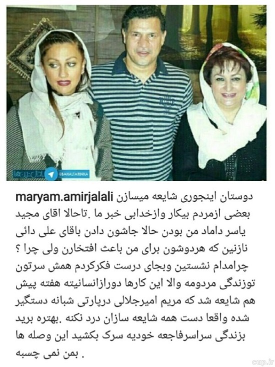 دوستان اینجوری شایعه میسازن بعضی ازمردم بیکار وازخدا بی خبر ما. تا حالا اقای مجید یاسر داماد من بودن حالا جاشون دادن باقای علی دایی نازنین که هردوشون برای من باعث افتخارن ولی چرا؟ چرا مدام نشستین و بجای درست فکرکردم همش سرتون توزندگی مردمه والا این کارها دورازانسانیته هفته پیش هم شایعه شد که مریم امیرجلالی درپارتی شبانه دستگیر شده. واقعا دست همه شایعه سازان درد نکنه .بهتره برید بزندگی سراسرفاجعه خودیه سرک بکشید این وصله ها بمن نمی چسبه.
