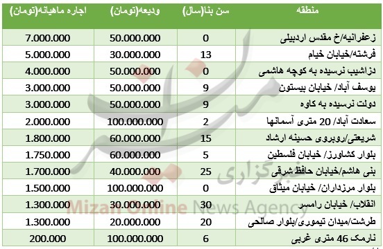 در این میان ودیعه رهن یک واحد مسکونی 100 متری در منطقه زعفرانیه از سوی مالک 50 میلیون تومان درنظرگرفته شده و اجاره ماهیانه آن 5 میلیون تومان تعیین شده است.