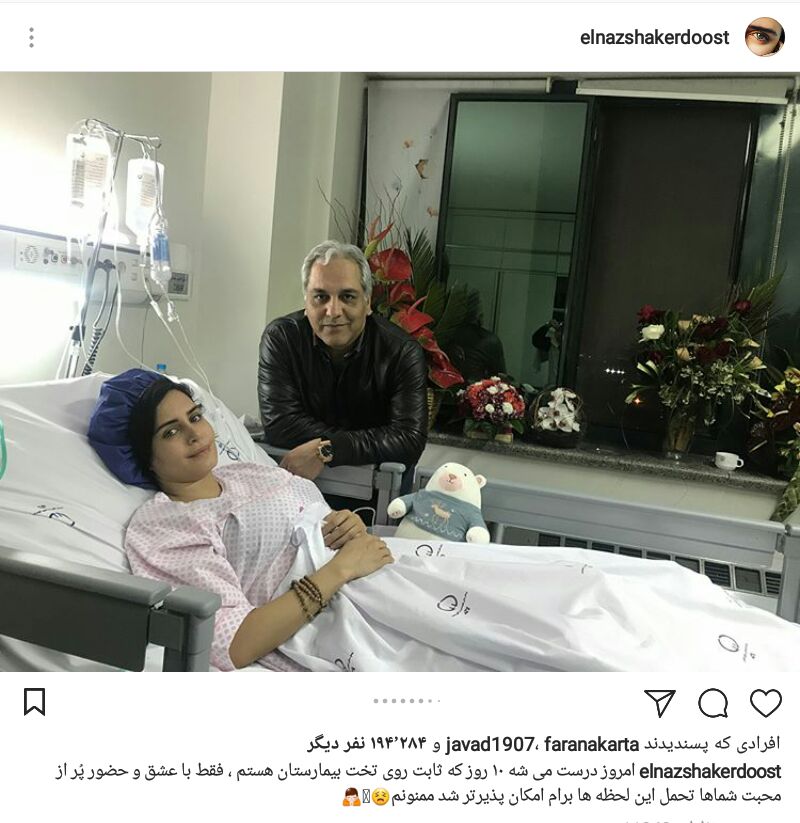 سایت سینما سینما: الناز شاکر دوست مدتی است به دلیل بروز حادثه در حین ظبط کار جدیدش در بیمارستان بستری است.مهران مدیری به همین دلیل از این بازیگر عیادت کرده است.