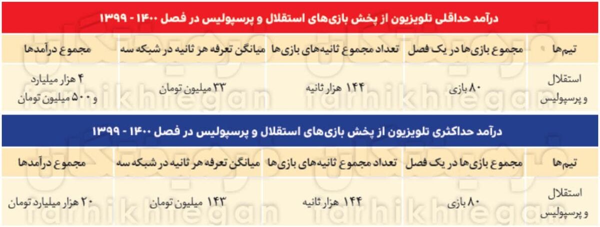 استقلال و پرسپولیس در سال فوتبالی که گذشت، هم در آسیا حضور داشتند و هم در لیگ و جام حذفی و هرکدام از این تیم‌ها تقریبا ۴۰ بازی پخش‌شده زنده از تلویزیون داشته‌اند.