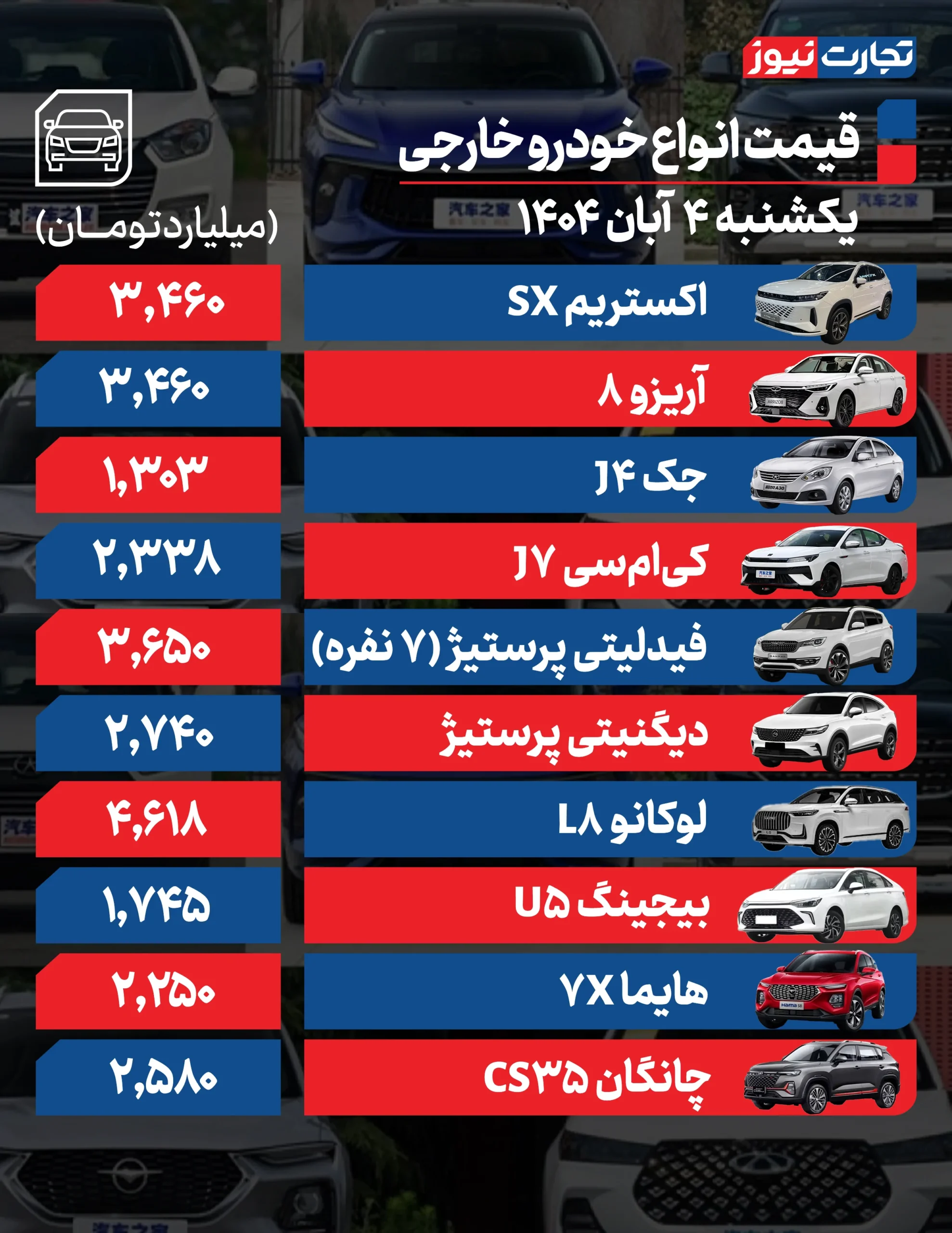 جدول قیمت خودرو امروز 4 آبان 1404