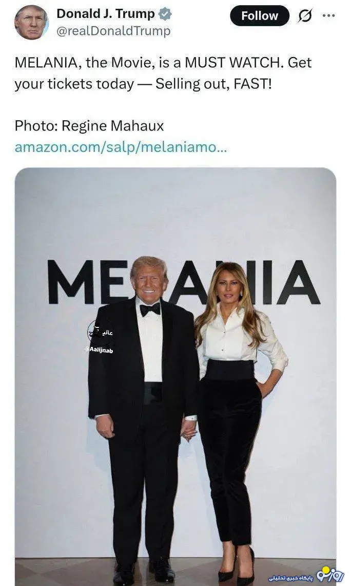 در شرایطی که دونالد ترامپ از چند جهت درگیری شدید سیاسی با کشور‌های مختلف دارد، توئیتی منتشر کرده و تبلیغ فیلم همسرش ملانیارو کرده و گفته سریع برید بلیط بخرید و فیلمش رو ببینید.