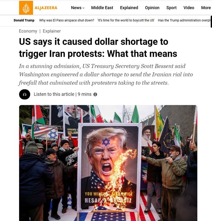 خبرگزاری الجزیره در گزارشی به نقش آمریکا در مهندسی ناآرامیهای اخیر در ایران پرداخته؛ ناآرامیهایی که بنا به نوشته این گزارش، به قیمت جان هزاران ایرانی انجامیده است.