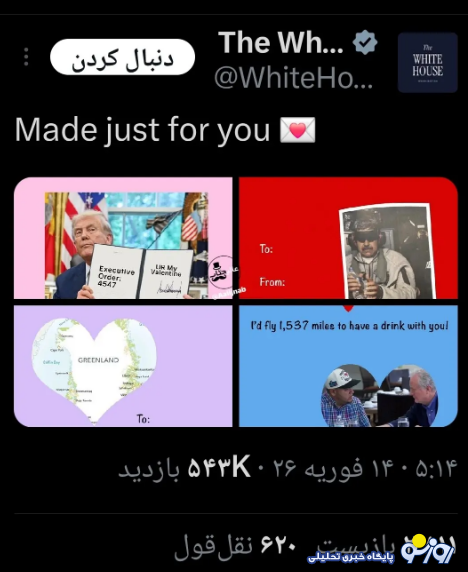روزنو :کاخ سفید در اقدامی غیرمعمول، کارت تبریک روز ولنتاین با تصویر گرینلند منتشر و بر رویکردی «صریح» تأکید کرد.